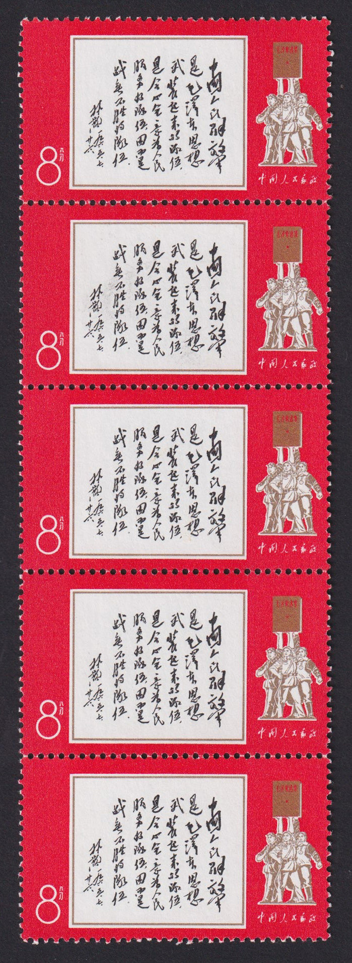 China 1968 8f red, black and gold, 41st Anniversary of the Chinese Liberation Army, vertical strip of five, SG2350.