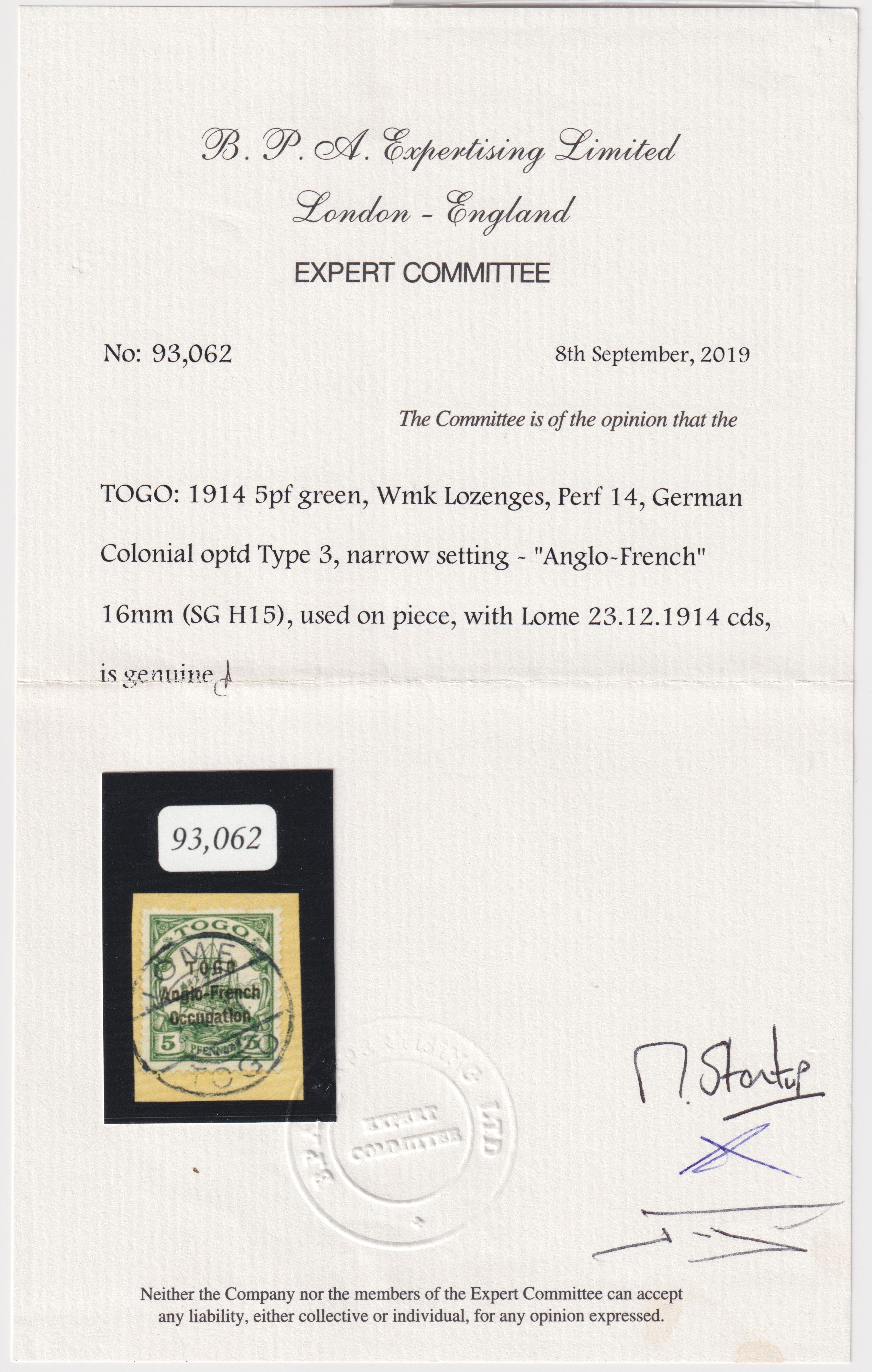 Accompanied with a 2019 British Philatelic Association (BPA) certificate of authenticity.