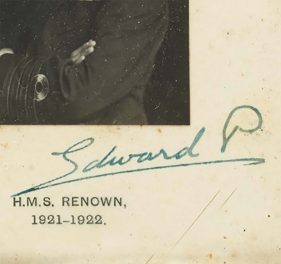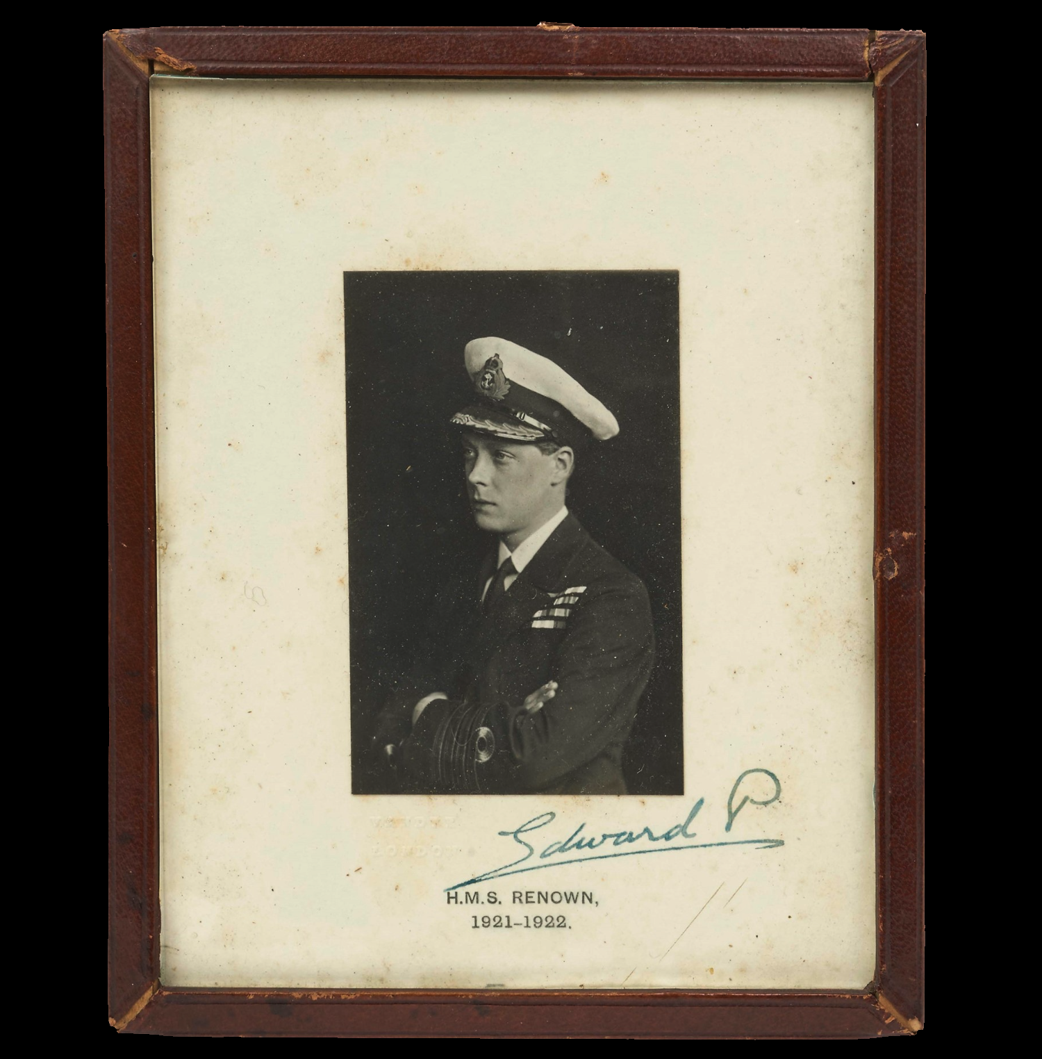 A presentation portrait photograph of the young King Edward VIII (when Edward Prince of Wales) in naval uniform, signed by the Prince, “Edward P”.