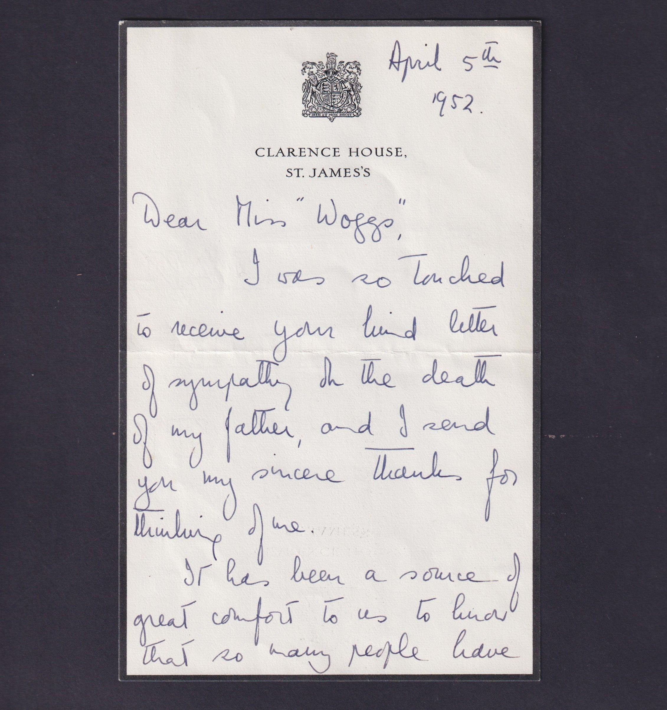 Handwritten letter from Queen Elizabeth II dated April 5, 1952 to “Miss Woggs” to thank her for a letter of sympathy after the death of King George VI, Queen Elizabeth’s father.
