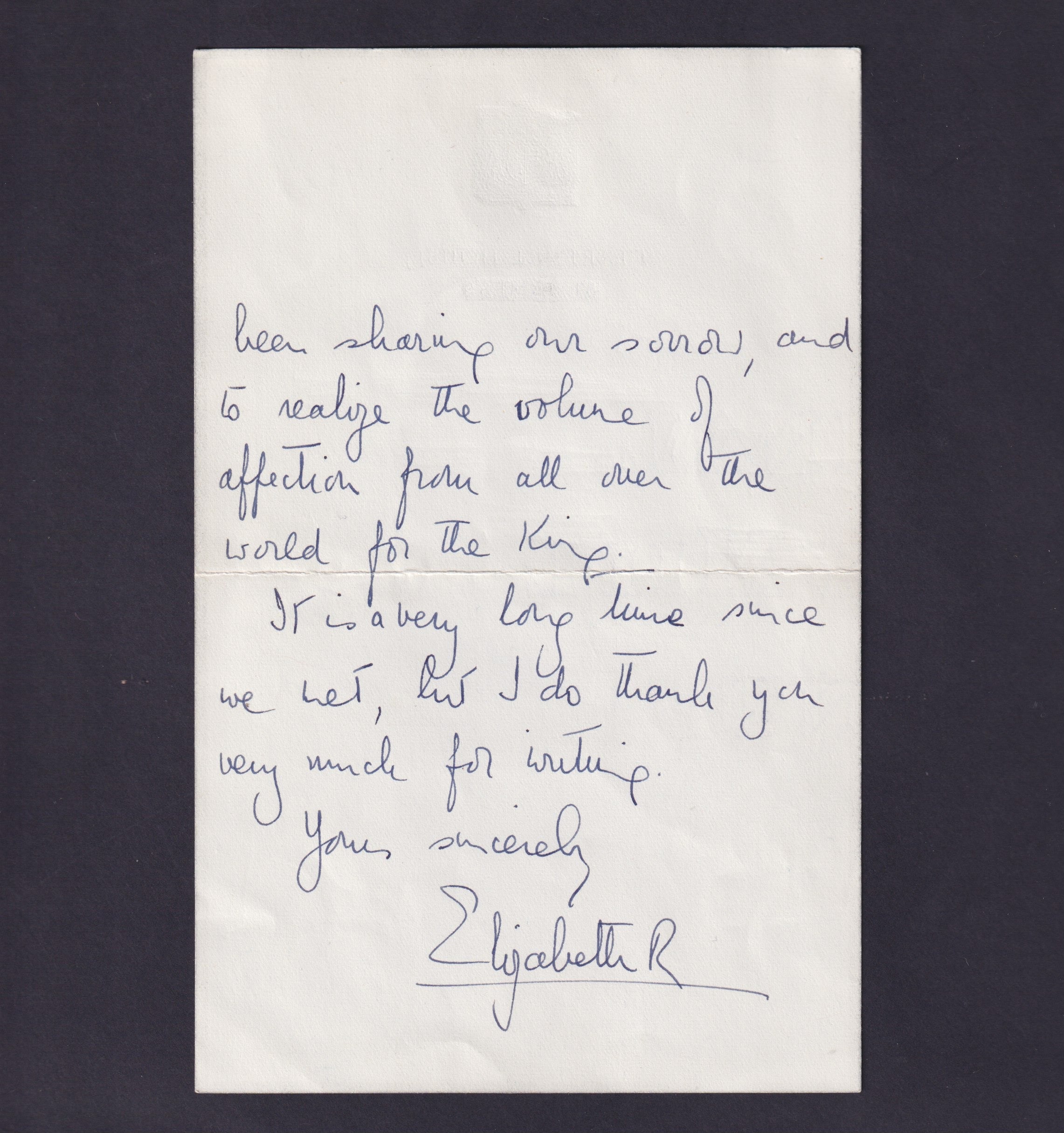 In the letter Queen Elizabeth writes: “It has been a source of great comfort to us to know that so many people have been sharing our sorrow, and to realise the volume of affection from all over the world for the King.”
