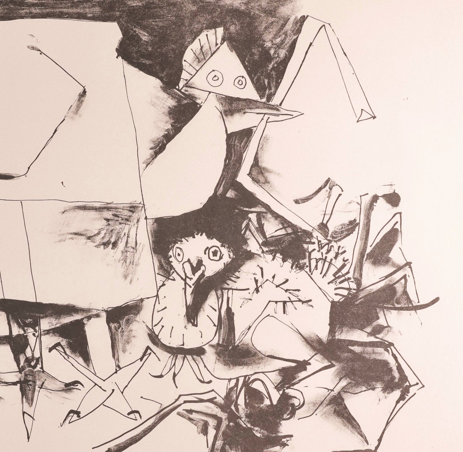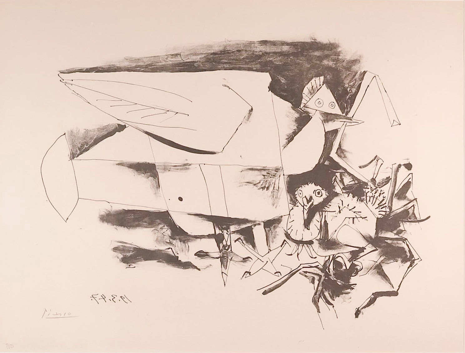 An original copy of Picasso's black & white lithograph Pigeon et ses petits' (Pigeon and her young), dated March 19, 1947 (original date inscribed on printing plate).