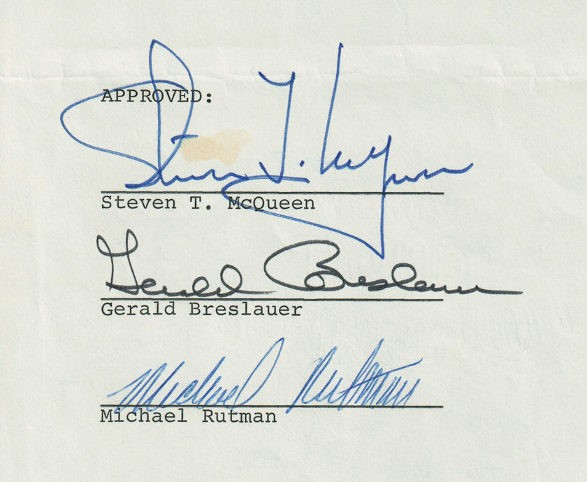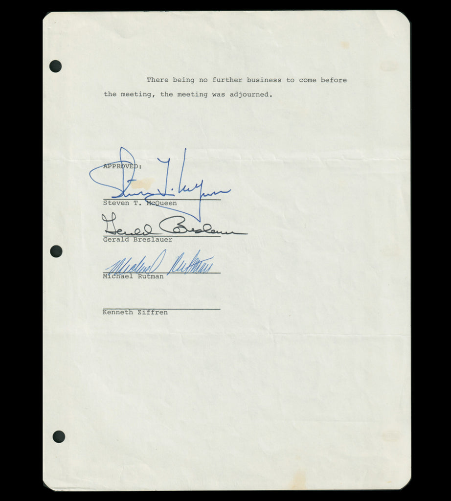 Breslaur was also on the board of directors of McQueen's production company Astral Productions, and similarities of the wording between this document and others suggest the minutes came from a meeting of that company.