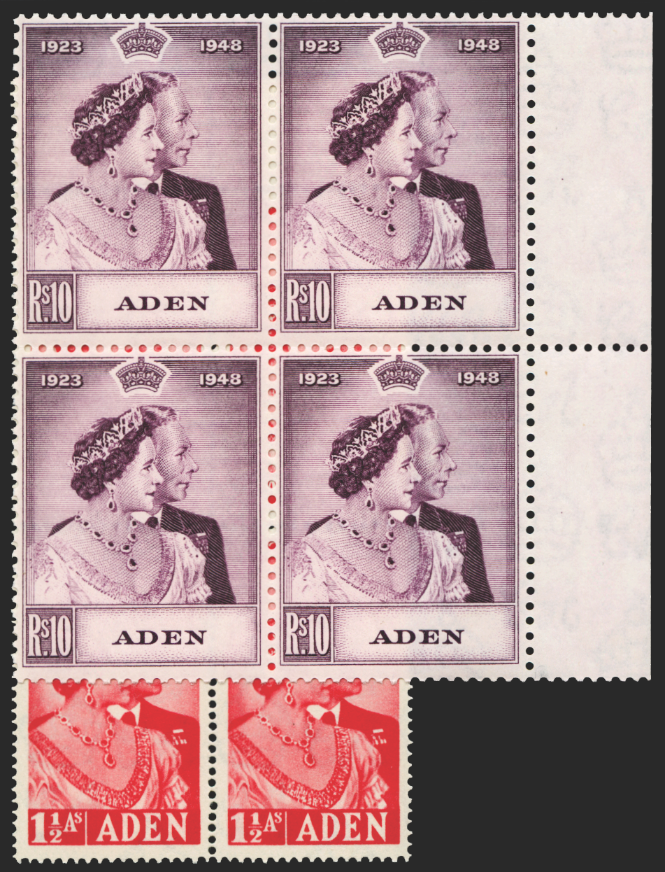 Aden 1949 Royal Silver Wedding 1½a and 10r, marginal blocks of 4, SG30/1.