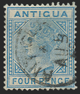 Antigua 1882 4d blue, Watermark CA, SG23a, variety 'Top left triangle detached' from Plate '2', right pane R3/3.