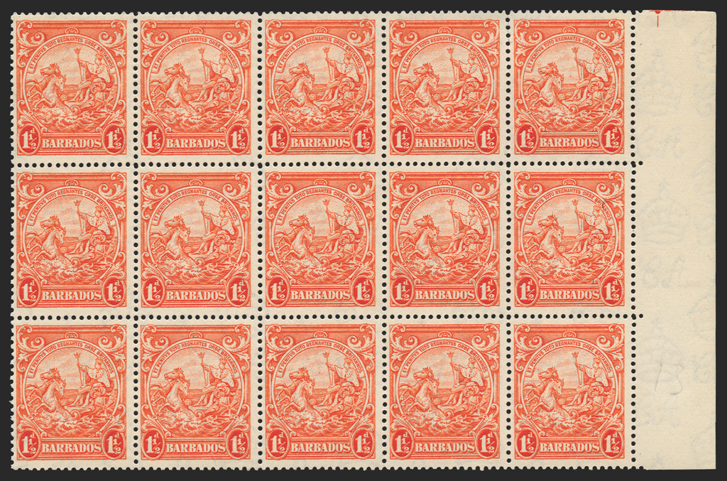 Barbados 1938-47 1½d orange, perforations 13½x13, right marginal block of 15 (5x3) from R7-9/6-10 showing guide-mark at upper right, R7/7 variety 'A' of 'CA' missing from watermark, SG250/a.