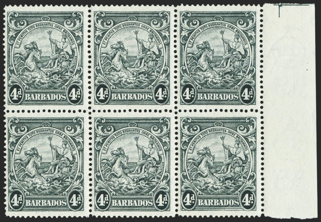 Barbados 1938-47 'Badge of the Colony' 4d black, perf 14, block of 6 (3x2) from right of sheet with part centre guide, showing variety 'Curved line at top right' on upper left stamp (R7/8), SG253d/db.