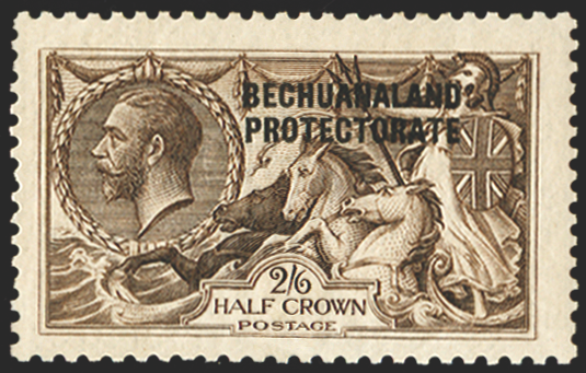 Such was the success and popularity of the famous Seahorses stamp issue in Great Britain that it was overprinted and used in other countries in the British Empire including Morocco, Offices in the Turkish Empire, Bechuanaland and Ireland. The stamp is considered a miniature piece of propaganda in response to the German threat posed to Britain at sea on the eve of World War I. The Seahorses boldly claimed Britain’s naval domination and reputation of being "ruler of the seas".