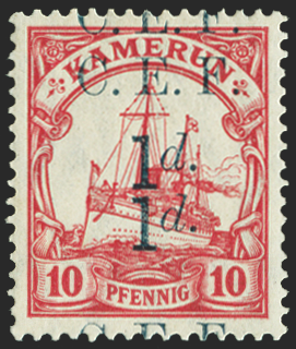 Cameroon 1915 1d on 10pf carmine, "Kaiser's Yacht", blue surcharge, error surcharge double (with one 'C.E.F.' divided between the top and bottom margins), SGB3b.