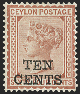 Ceylon 1885 10c on 64c red-brown, type 22 local surcharge, perforations 14, SG164.