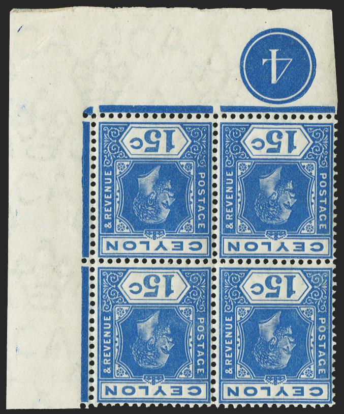 Ceylon 1912-25 15c ultramarine Watermark MCA, variety watermark inverted, lower right corner block of 4 with plate number '4', SG311aw.