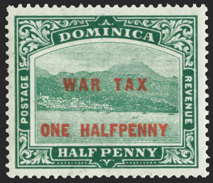 Dominica 1916 (Sept) 'War Tax' ½d on ½d deep green, type 12 surcharge in red, variety 'Watermark sideways reversed', SG55x.