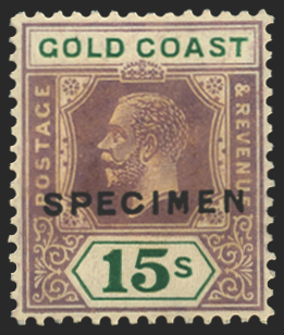 Gold Coast 1921-24 15s dull purple and green, script watermark, die II, overprint ‘SPECIMEN’, SG100as.