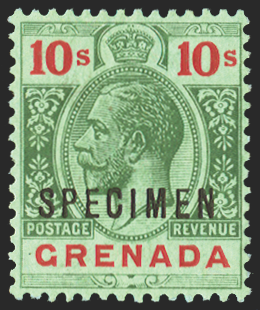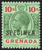 Grenada 1913-22 10s green and red/emerald back, watermark MCA, overprint 'SPECIMEN', SG101as.