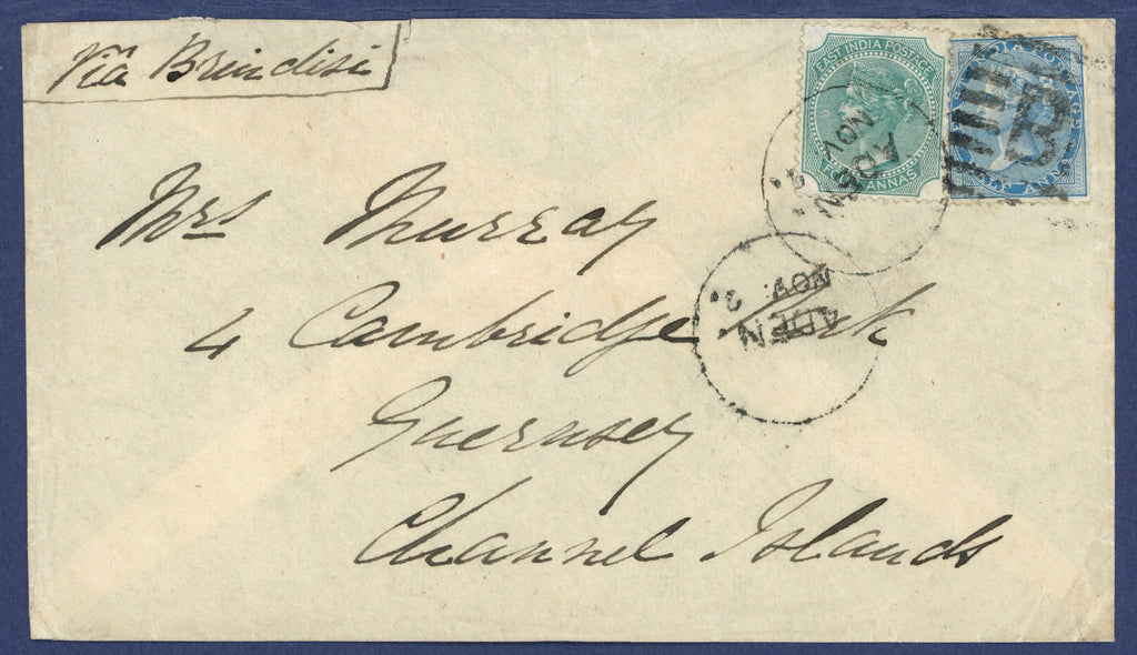 India Used Abroad Aden 1880 (2 Nov.) envelope to Guernsey, marked "Via Brindisi", bearing ½a. blue and 4a. green East India cancelled by "B" in bars and Aden circular date stamp and showing Guernsey arrival datestamp (17.11) on reverse.