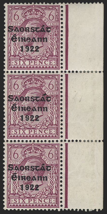 Ireland 1922-23 6d reddish purple, type 5 overprint by Thom, right marginal vertical strip of 3, the centre stamp variety 'Accent inserted by hand' (R15/12), SG60a.