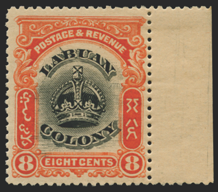 North Borneo Labuan 1902-03 8c black and vermilion 'Crown', perforations 13½-14, right marginal, showing variety 'line through B' (R5/10), SG121b.