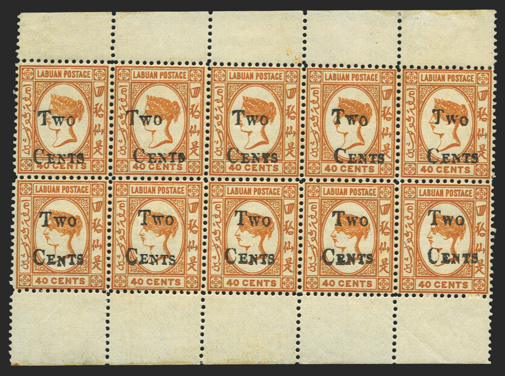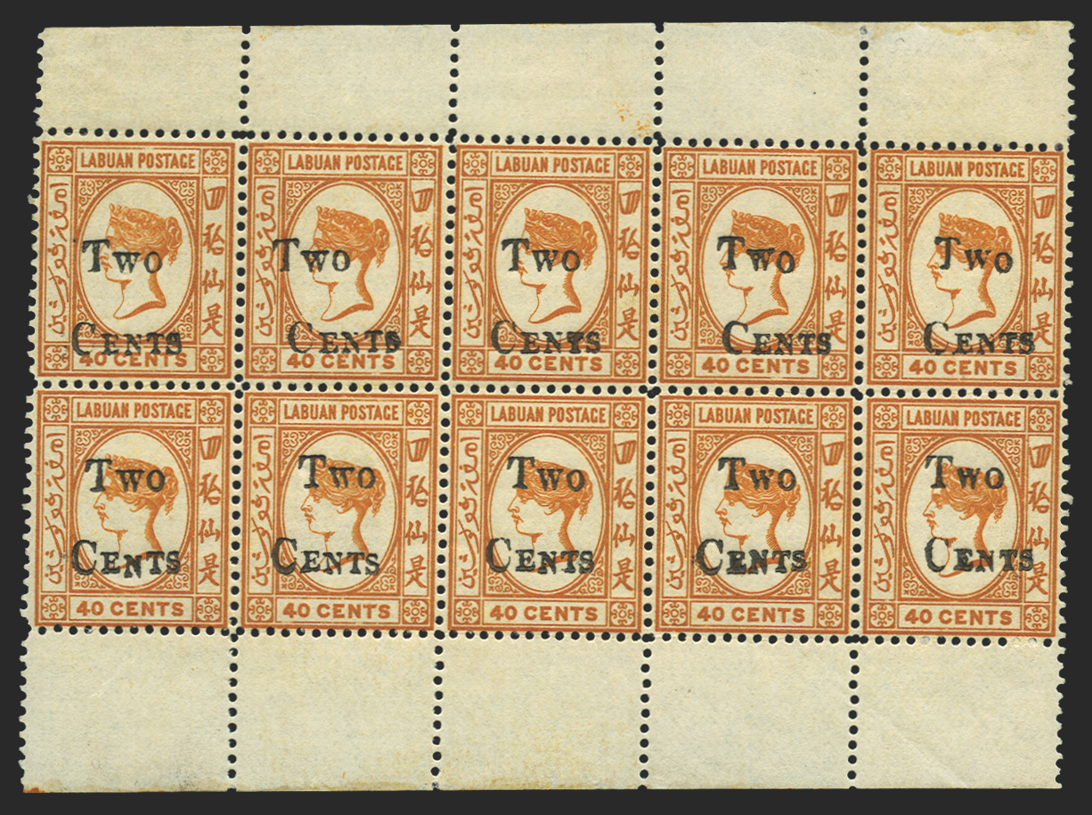 North Borneo Labuan 1892 (Dec) 2c on 40c ochre, type 11 surcharge, sheet of 10 (5x2) with left and right margins removed, showing the complete setting, SG49.