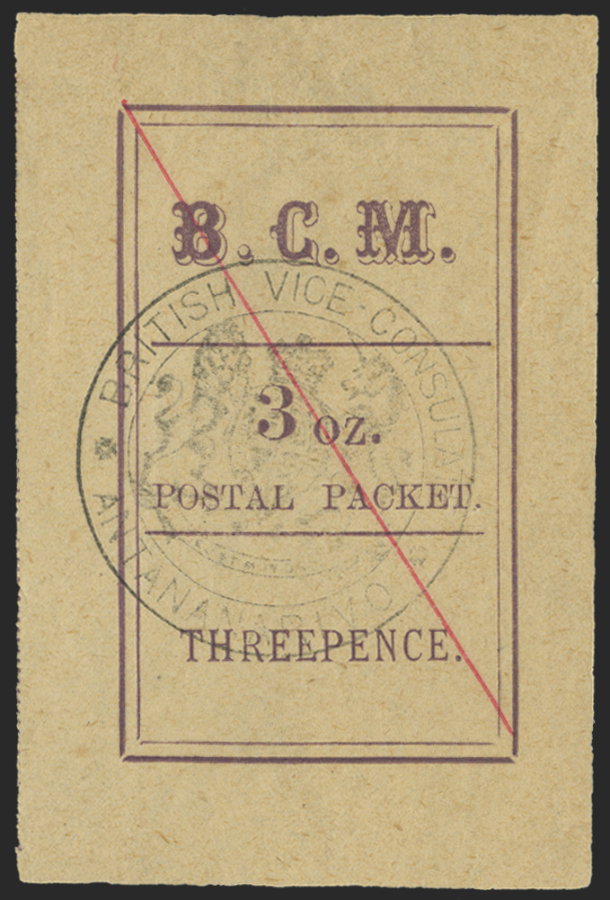Madagascar 1884 3d (3oz) magenta "POSTAL PACKET", hand stamped "British Vice-Consulate", hollow stop after "B", cancelled by red ink line, with corner gumming intact, SG7.