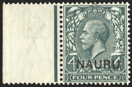 Nauru 1916-23 4d slate-green, overprint double, one albino, left marginal example. The albino impression 1½ mm below and to left of the inked overprint, and detectable from face, SG8b.