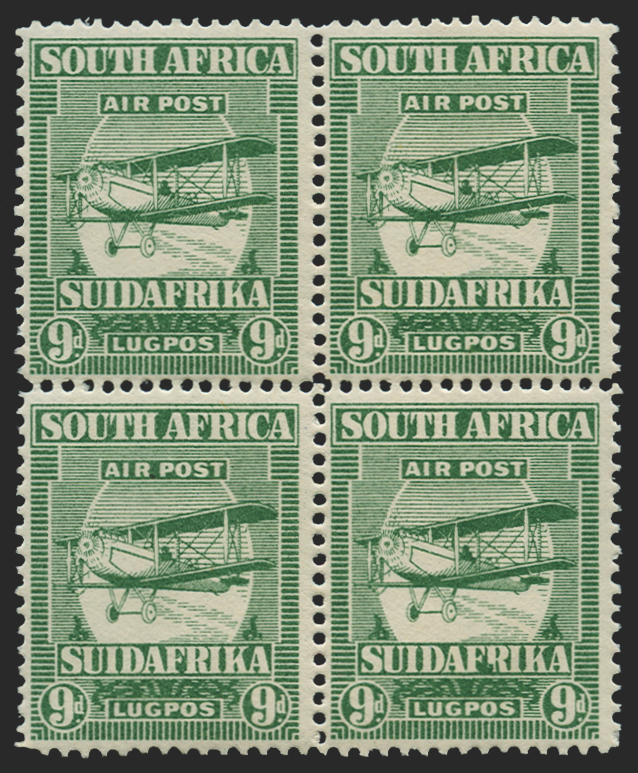 South Africa 1925 'Air Mail' 9d green, lower left corner block of 4, with lower right stamp (R12/8) showing "Broken R" in "SUIDAFRIKA" (Reference: Union Handbook 19 V3), SG21var.