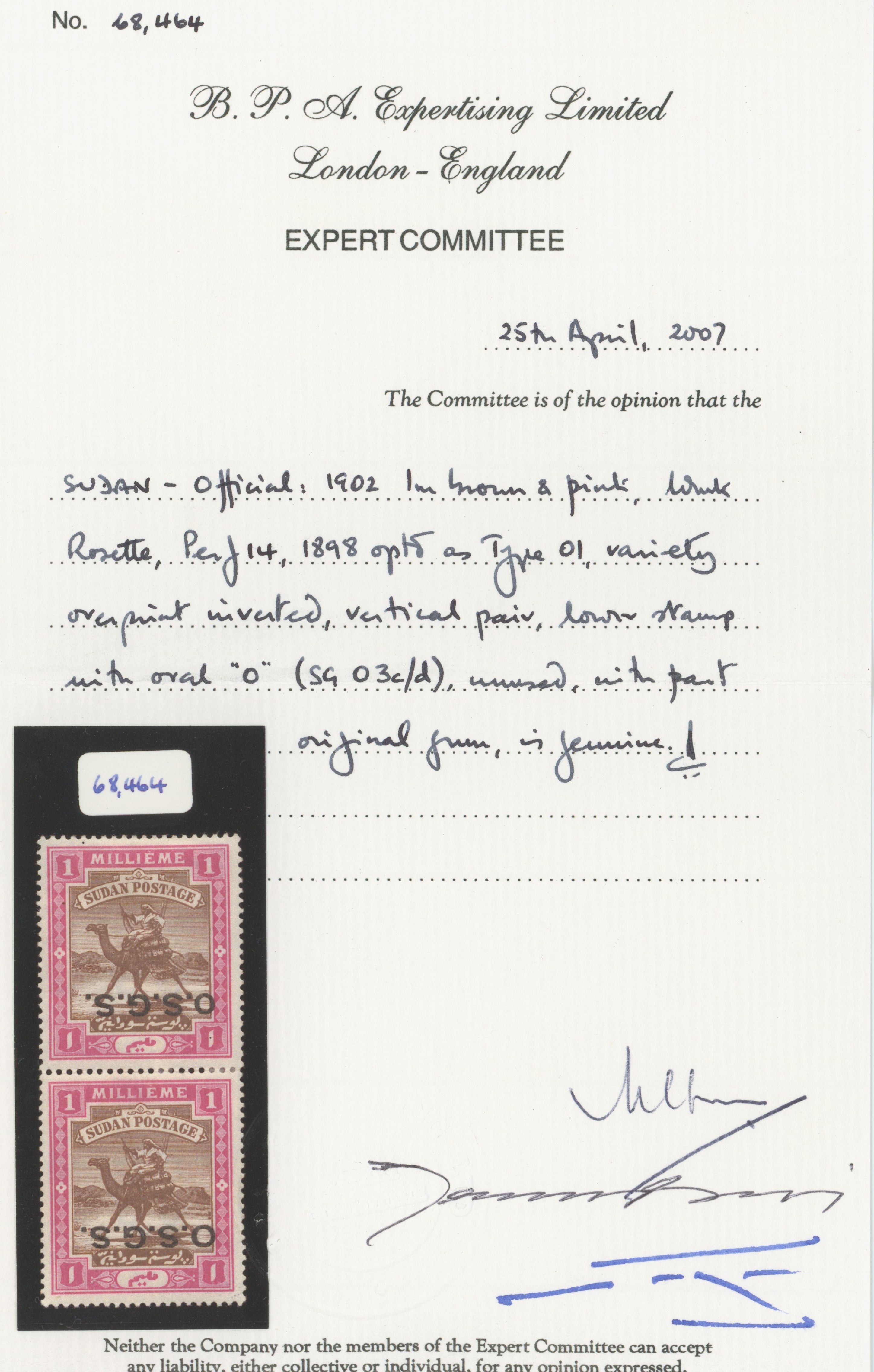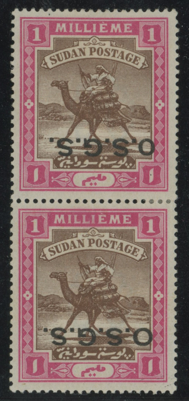 Sudan 1902 1m brown and pink Official, Type O1 'O.S.G.S.' overprint, vertical pair, 'ERROR OVERPRINT INVERTED', from position 19/13 of the setting, position 19 additionally with printing variety ‘Oval O’, SGO3c/d.