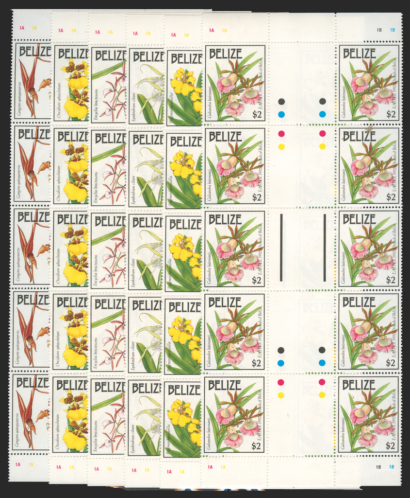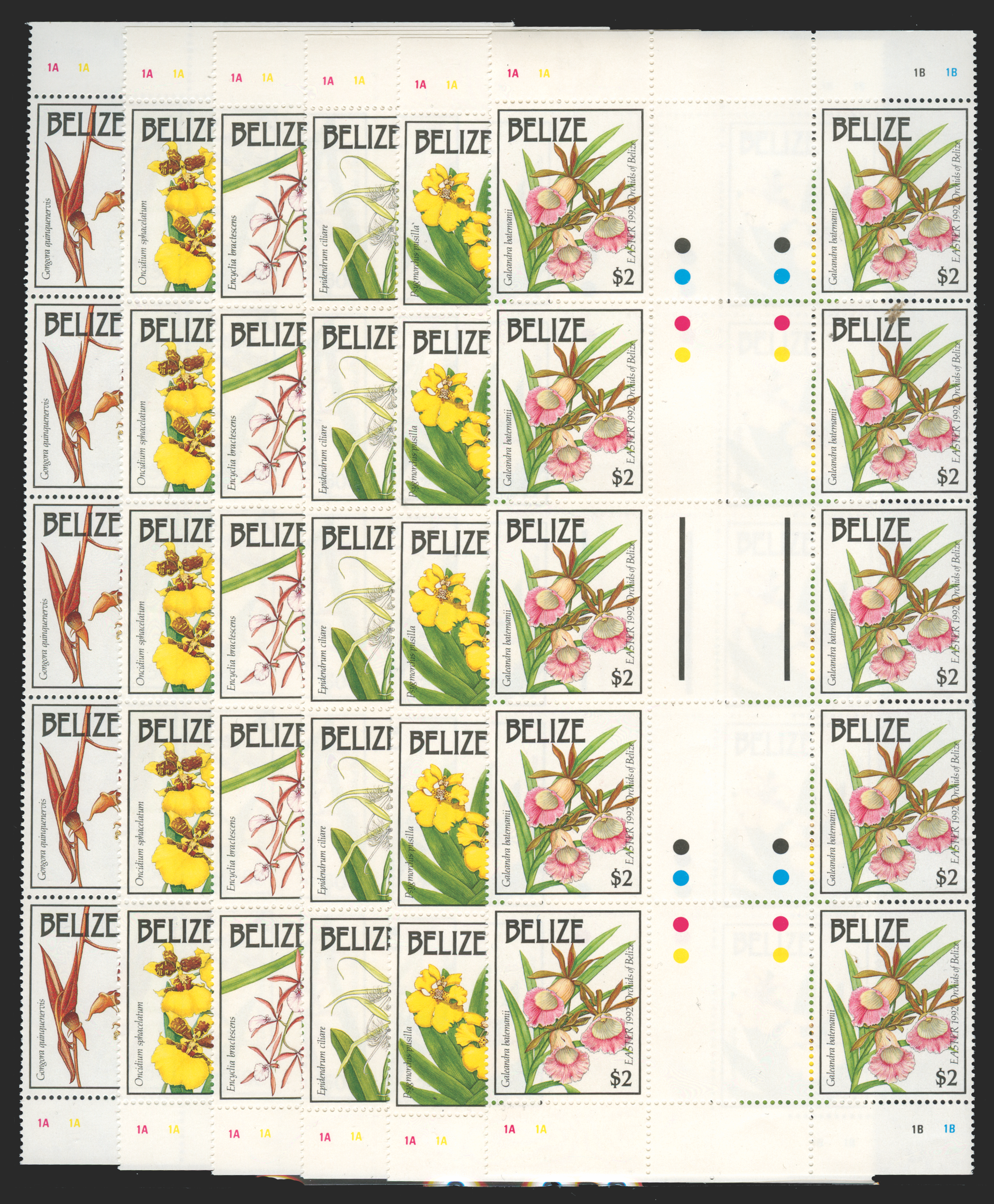 Belize 1992 'Easter 1992 Orchids of Belize' set of 6 to $2, matching interpane blocks of 10 (2x5), each being the two centre columns of a sheet with '1A' and '1B' plate numbers, SG1120/5.
