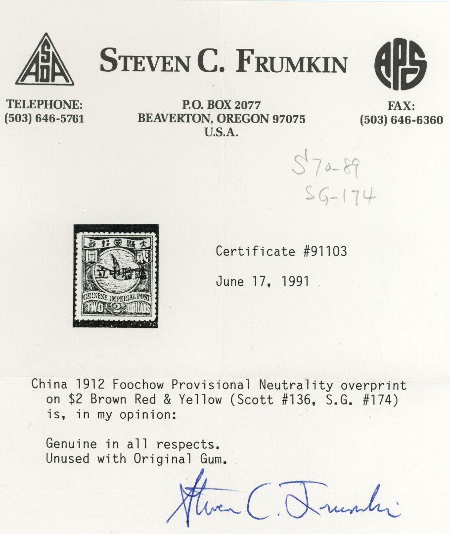 A superb example of the rare 1912 Provisional Neutrality issue, featuring a crisp overprint on the $2 claret and yellow “Chinese Imperial Post” design.