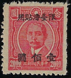 China Taiwan 1946-48 $100 on $20 scarlet, SG73, Sun Yat-sen seventh issue.