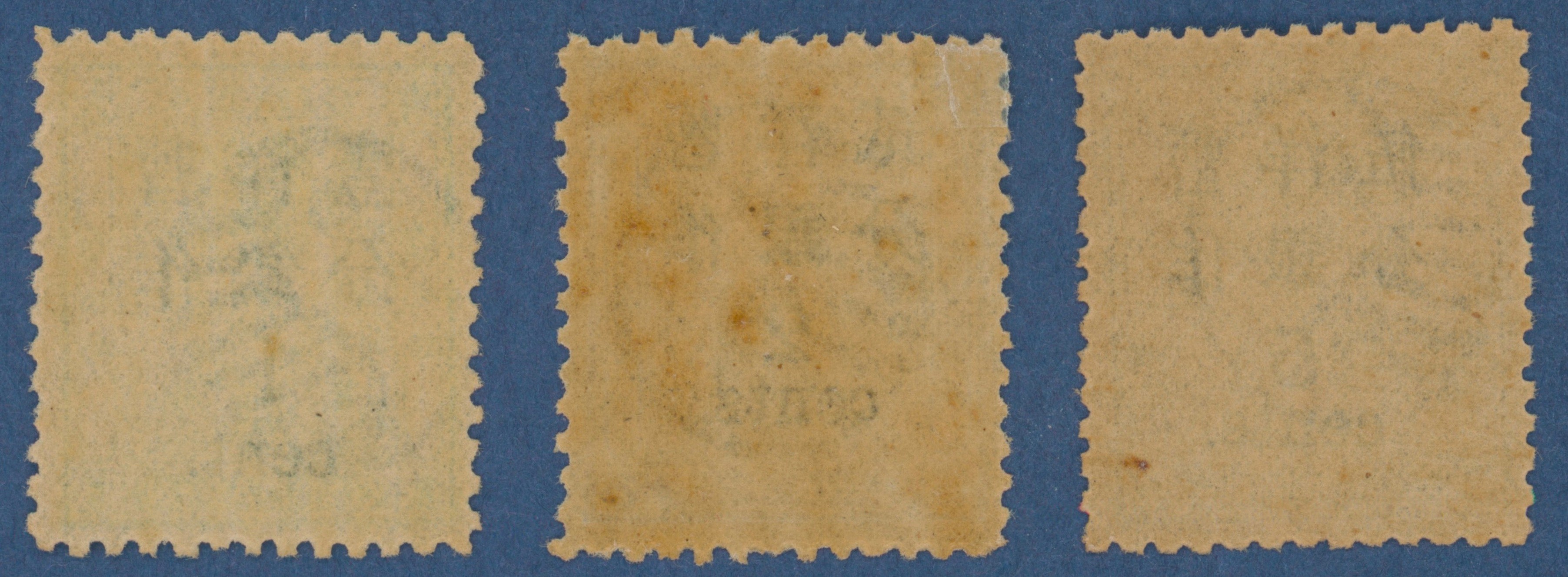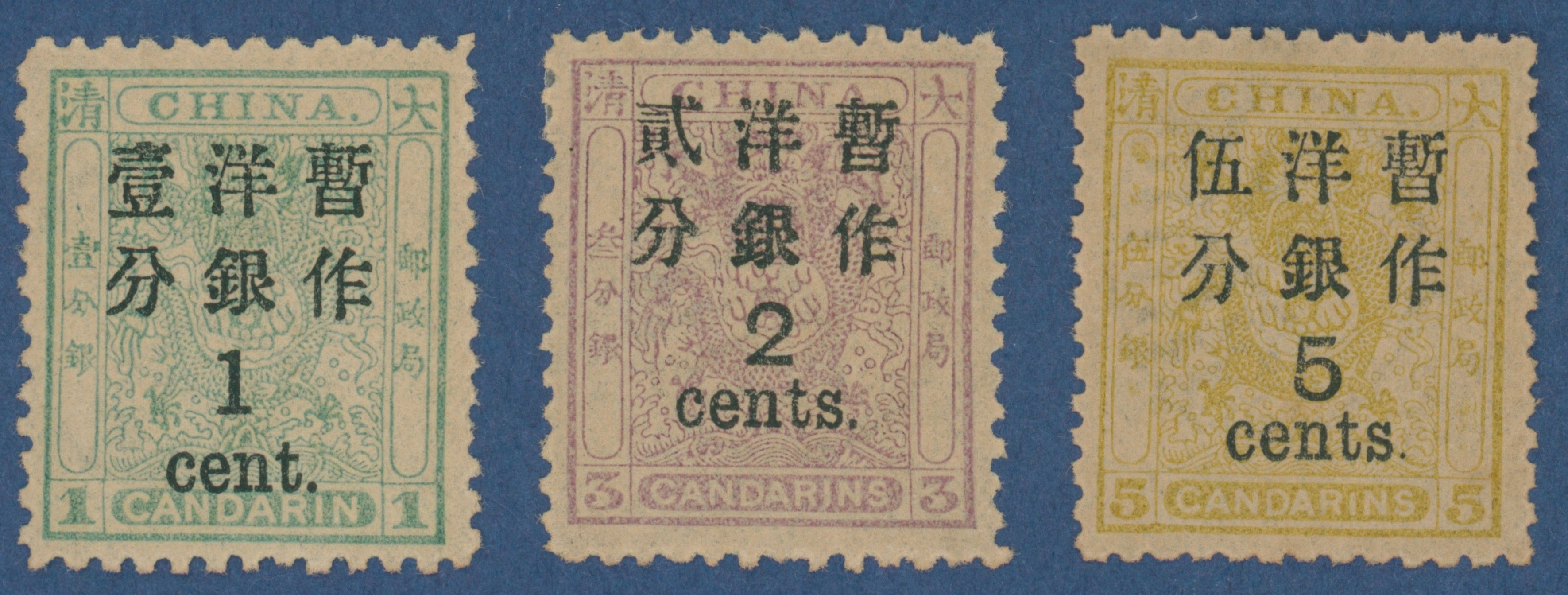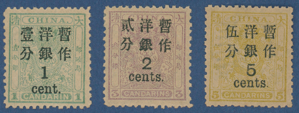 China 1897 (May) large figure surcharges spaced 1½mm on 'Small Dragons', set of 3 to 5c on 5ca olive-yellow, SG66/68.