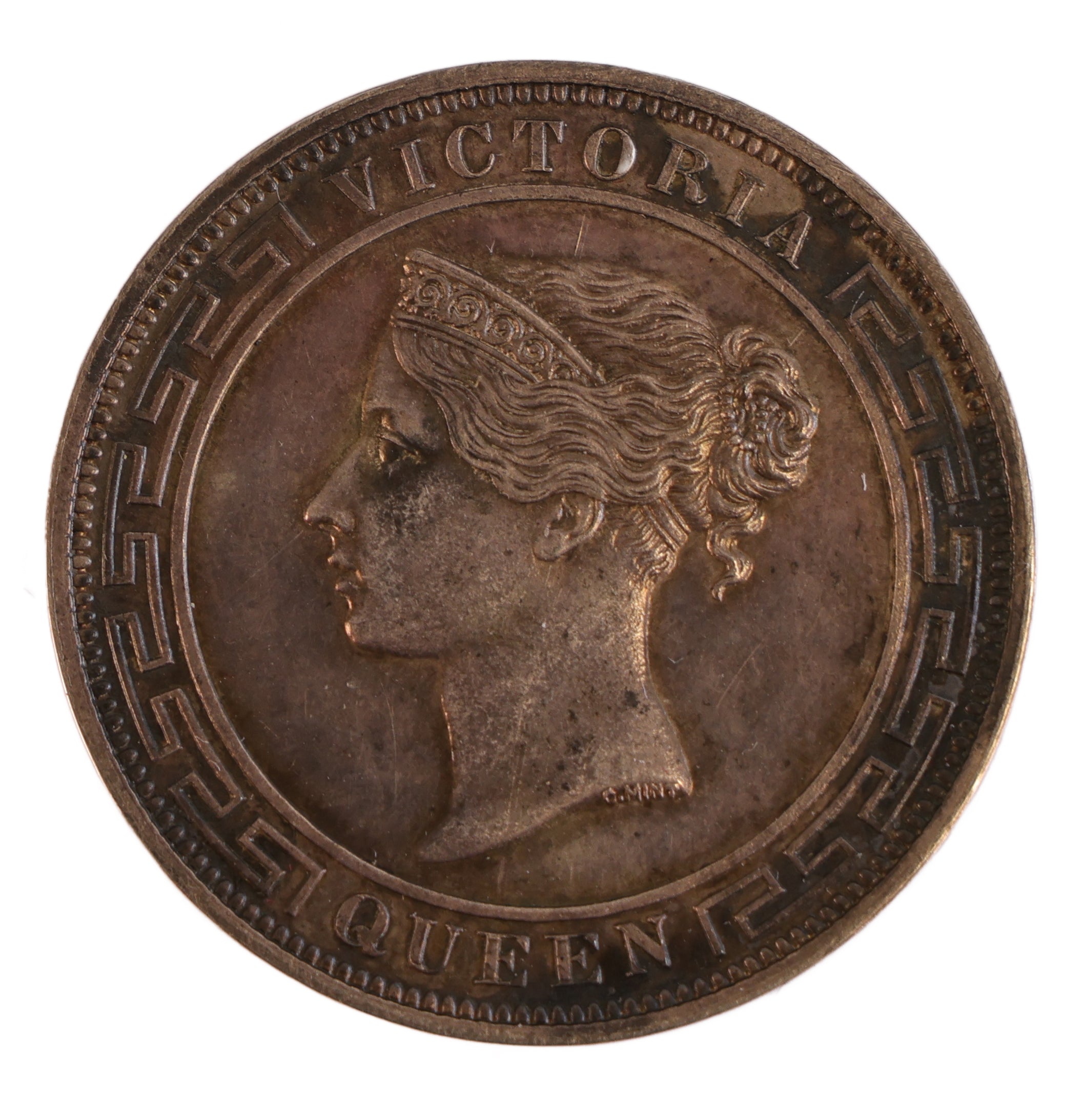 Obv. Bust left, Greek key design border, ‘VICTORIA QUEEN’.