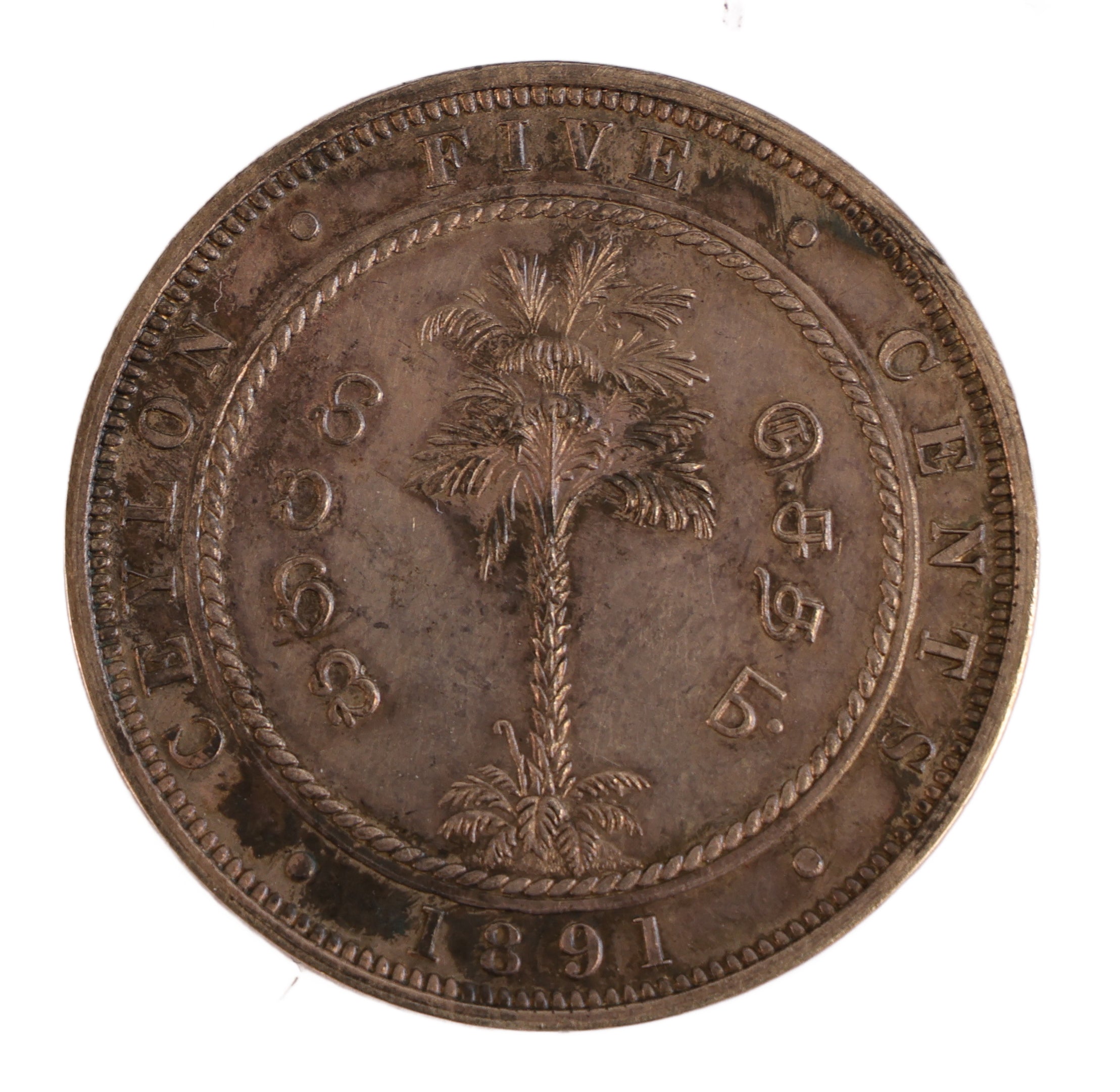 Rev. Date Palm, ‘CEYLON FIVE CENTS 1891’ Ceylonese legend either side of tree.