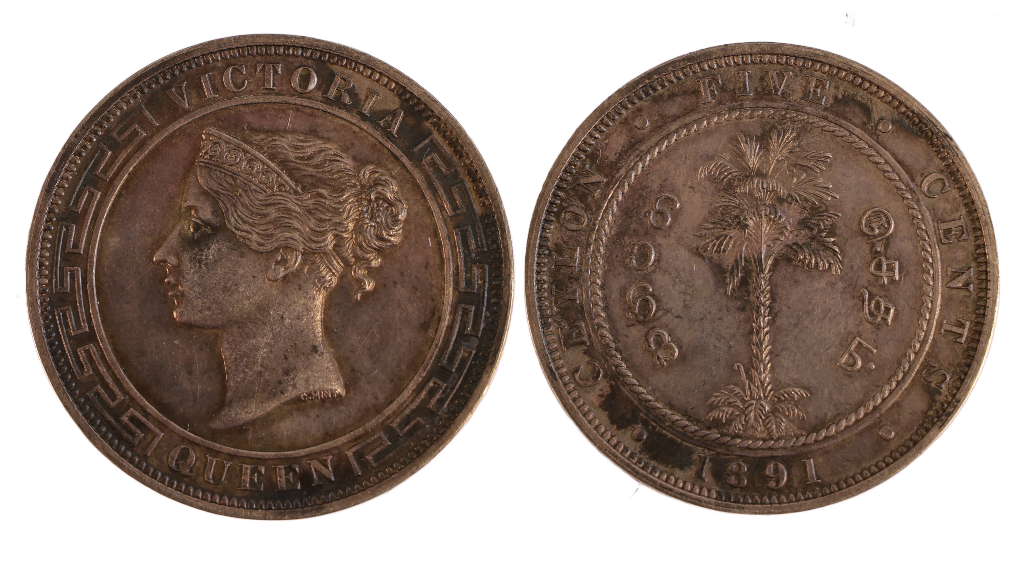 Ceylon Victoria proof silver (rather than copper) Five cents, 1891.