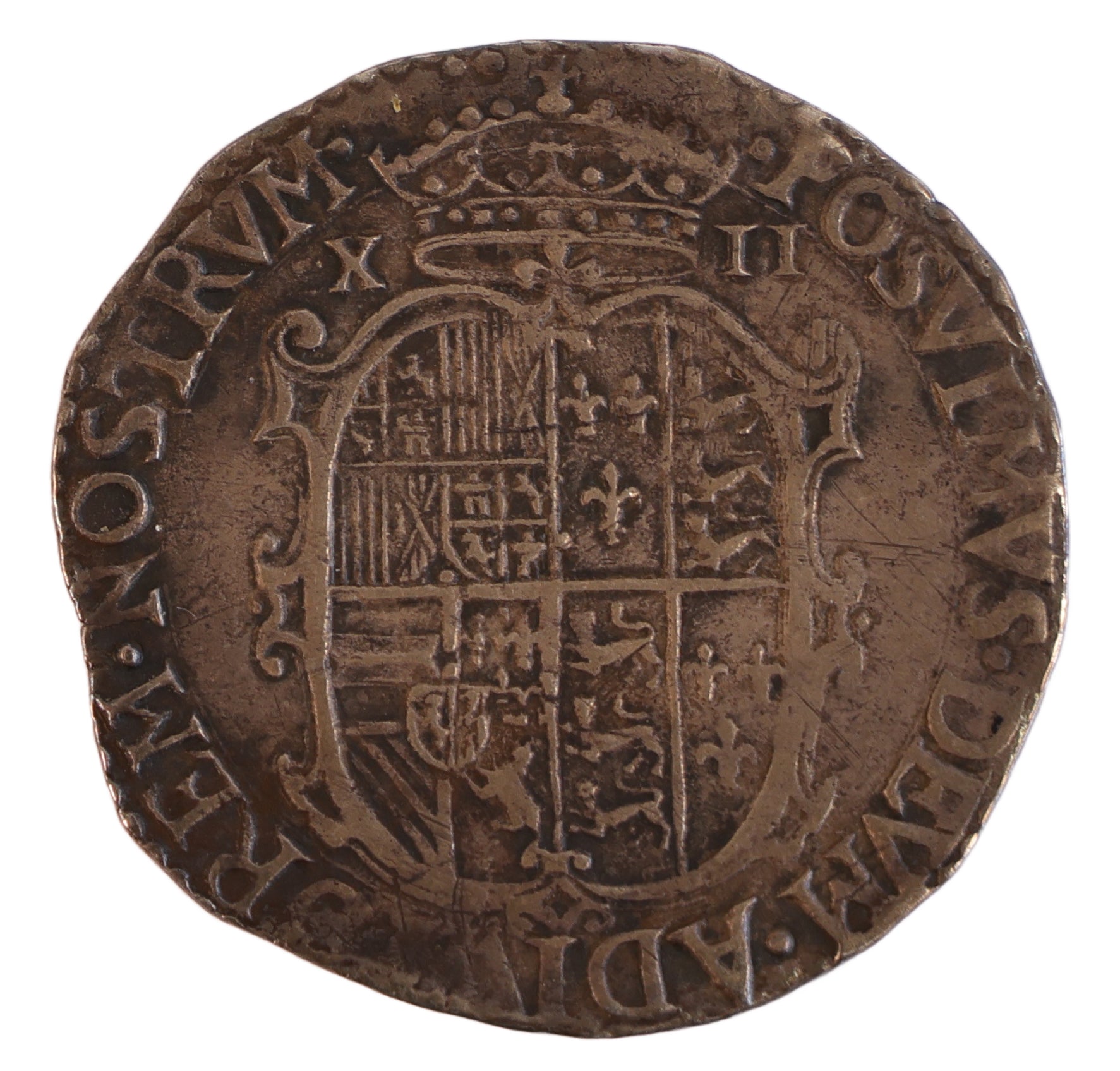 Rev. Crowned Royal Arms of Spain and England. Denomination (All) by crown, ‘POSVIMVS DEVM ADIVTOREM NOSTRVM’, (We have made god our helper).