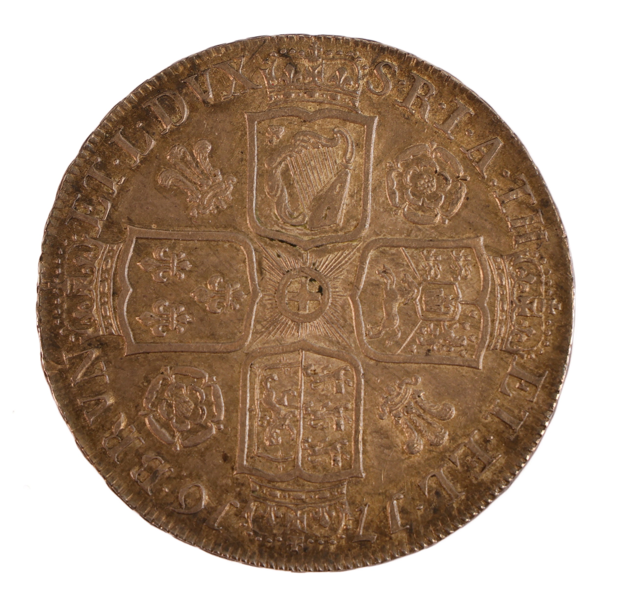 Only the slightest cabinet friction on raised surfaces, underlying mint lustre below light toning. Very attractive coin — first Hanoverian crown. The roses and plumes on the reverse signify that the metal of which these coins were made came from the silver mines in the West of England (rose) and the those in Wales (plumes).