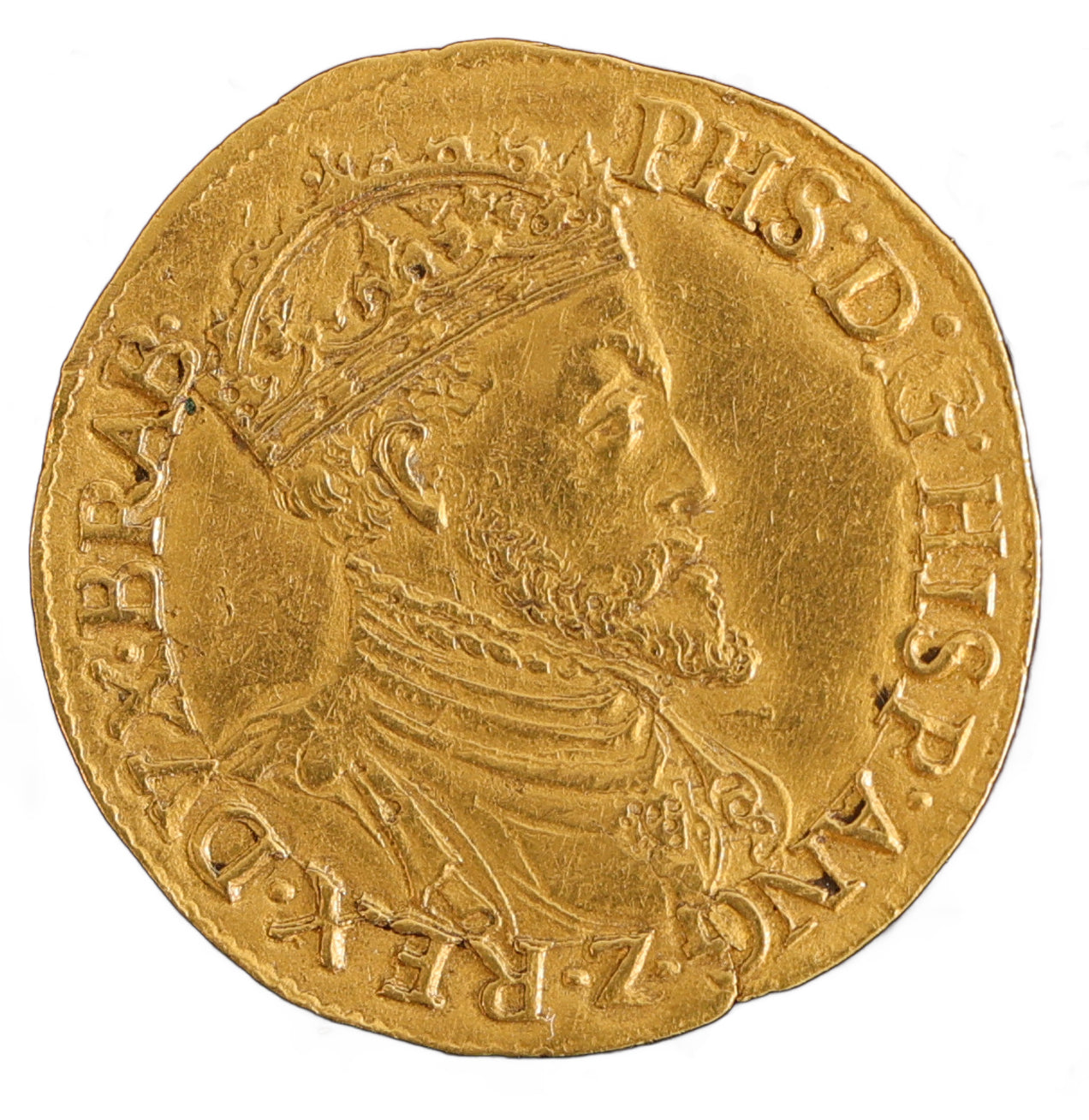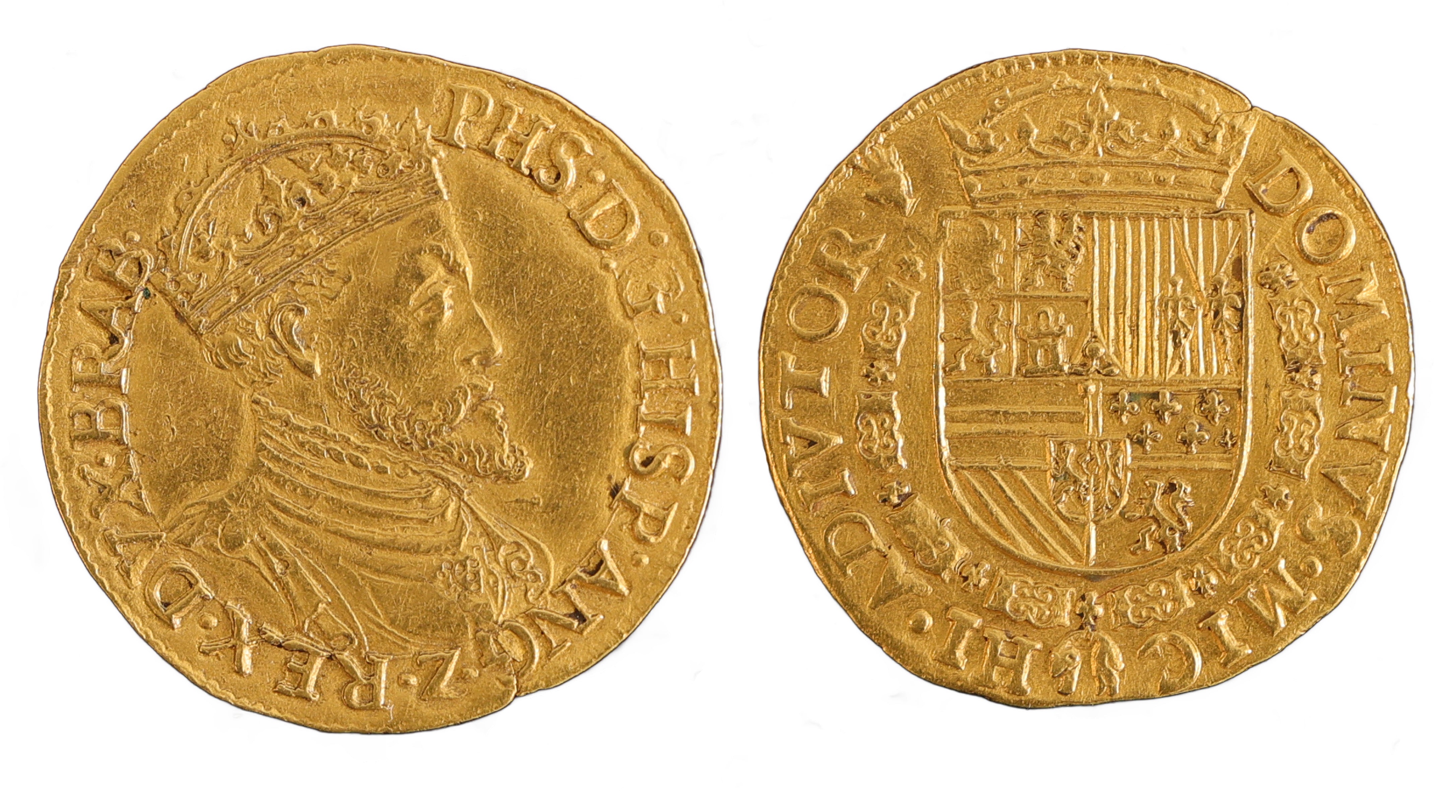 Obverse: Crowned, cuirassed bust cf Philip right, ‘PHS DG HISP ANG Z REX DVX BRAB' (Philip, by the grace of God, king of Spain and England, Duke of Brabant).