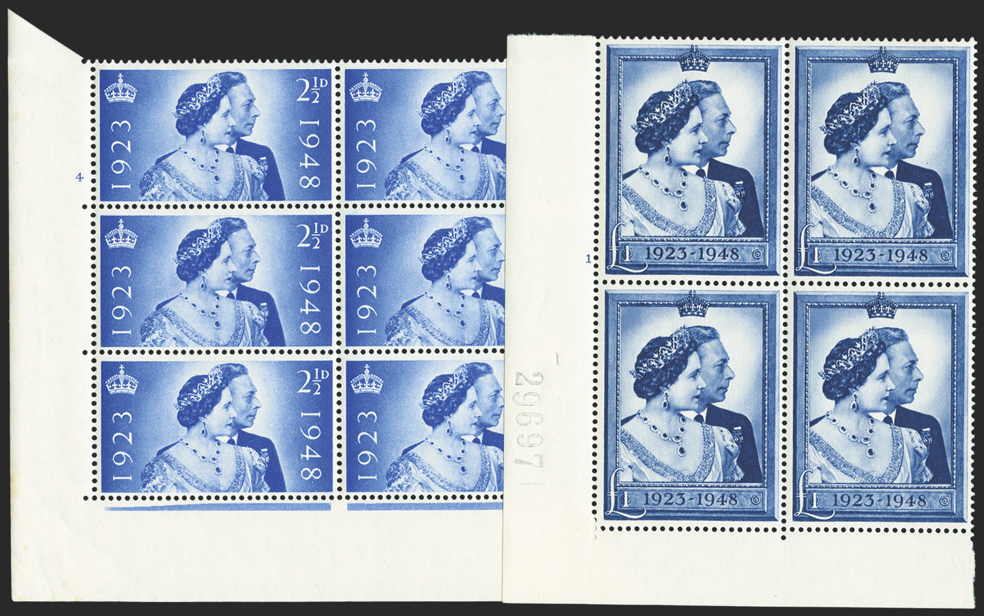 Very fine unmounted mint, with full original gum, set of two bottom left hand corner marginal cylinder blocks. The 2½d block of six, cylinder 4 no dot & £1 block of four, cylinder 1 no dot.
