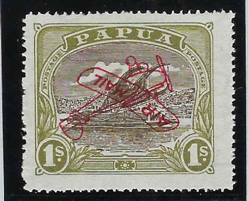 Papua 1930 'Air Mail' 1s sepia and olive, Harrison printing, type 11 overprint, ERROR OVERPRINT INVERTED, SG117a.
