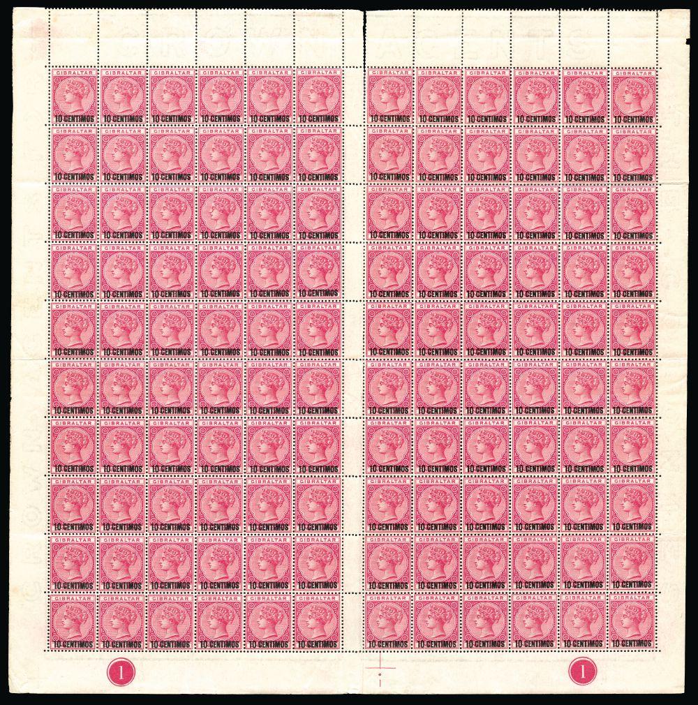Gibraltar 1889 10c on 1d rose, folded lower half sheet of 120 comprising two panes 6x10 with gutter between, with full margins showing plate number x2, unmounted original gum.