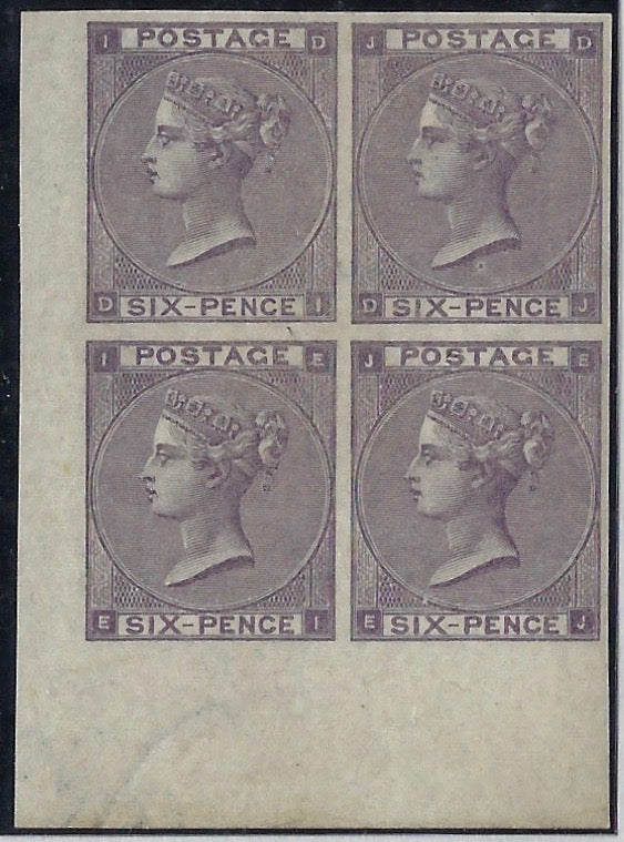 Very fine and fresh unused original gum corner marginal imperforate block of four lettered DI-EJ.