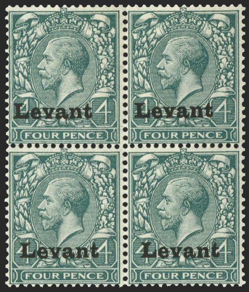 British Levant 1916 'Salonica' 4d grey-green, type S1 overprint, block of 4, all with inverted albino overprints on the gummed side, SG5var.