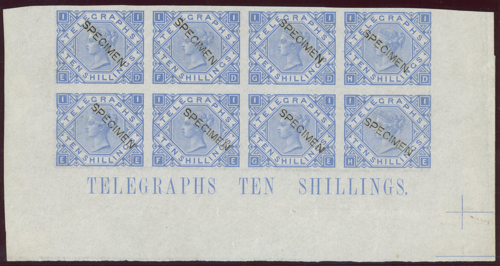 A superb unmounted mint, with full original gum, block of eight lettered 'ED-HE' from the bottom of the pane with full sheet margin and inscription. Printed in ultramarine, overprinted "SPECIMEN" type 8.