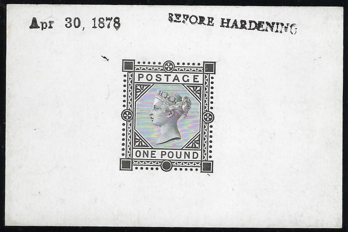 Great Britain 1878 £1 Die Proof. SG129var. Very fine example printed in black on white glazed card (91x60mm), dated at upper left "Apr 30, 1878" and endorsed "BEFORE HARDENING". Scarce. 1995 Holcombe Certificates.