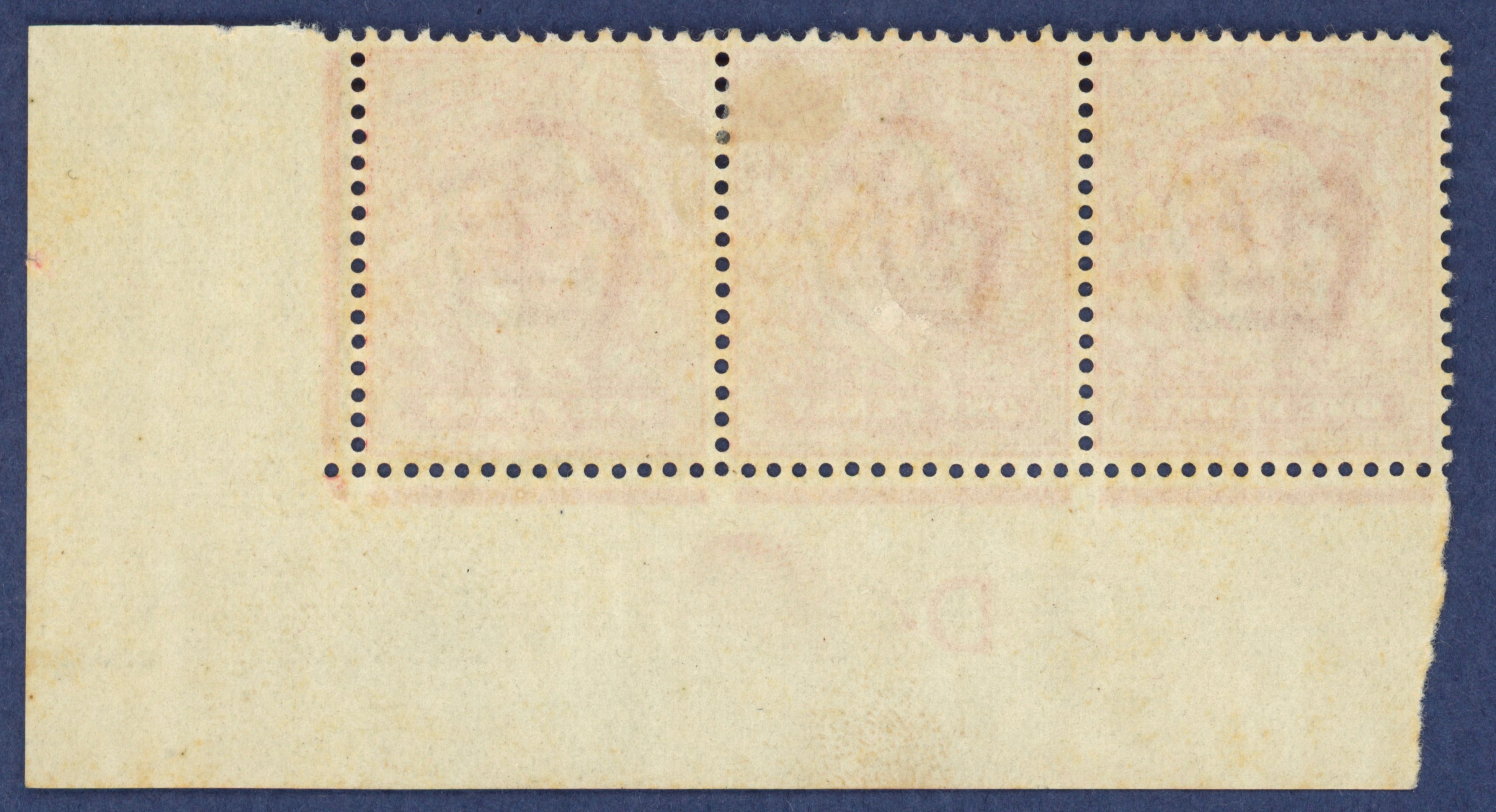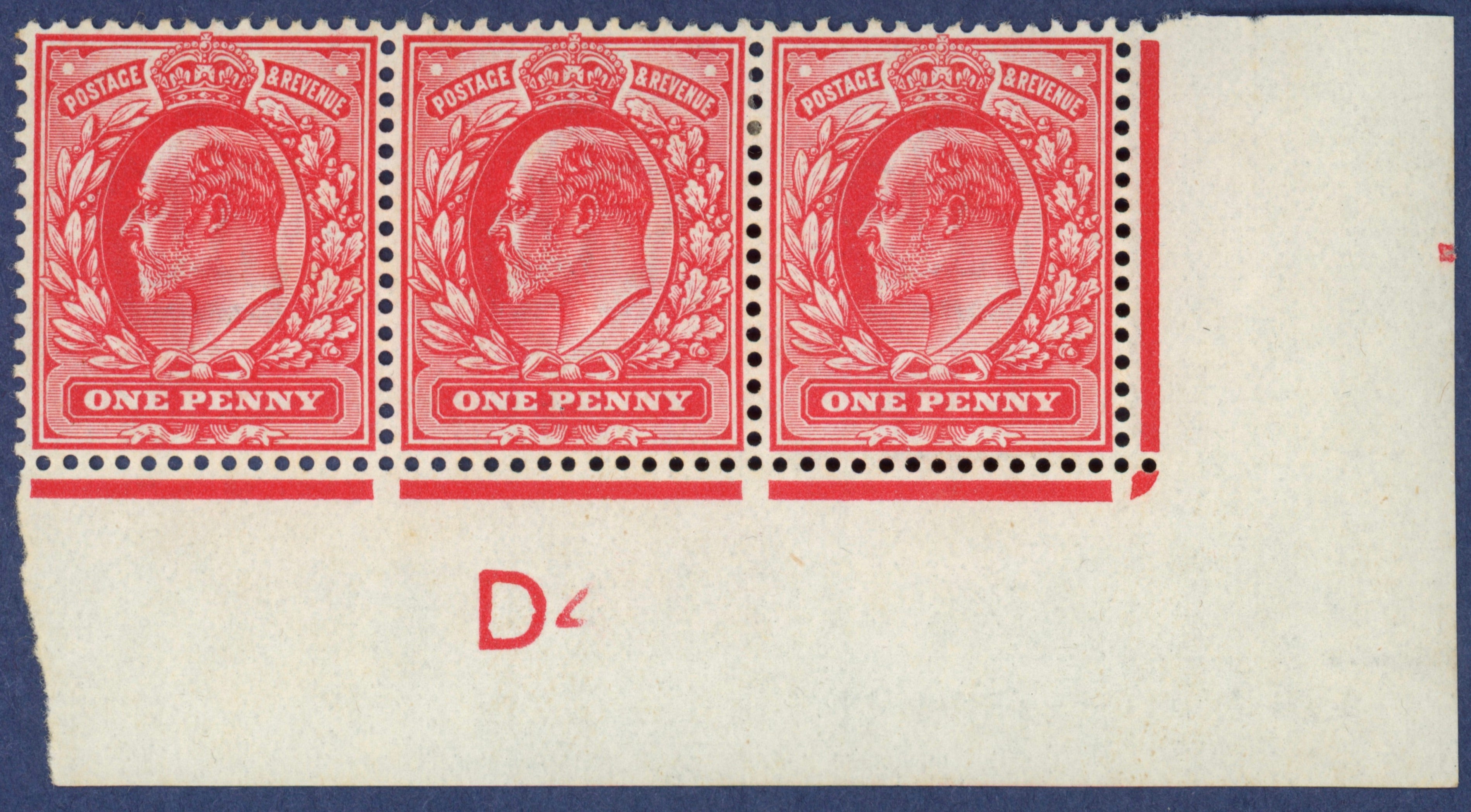 A superb unused, with original gum, bottom right hand corner marginal "D4" (I) control strip of three printed by De La Rue, showing the variety "4" almost omitted.