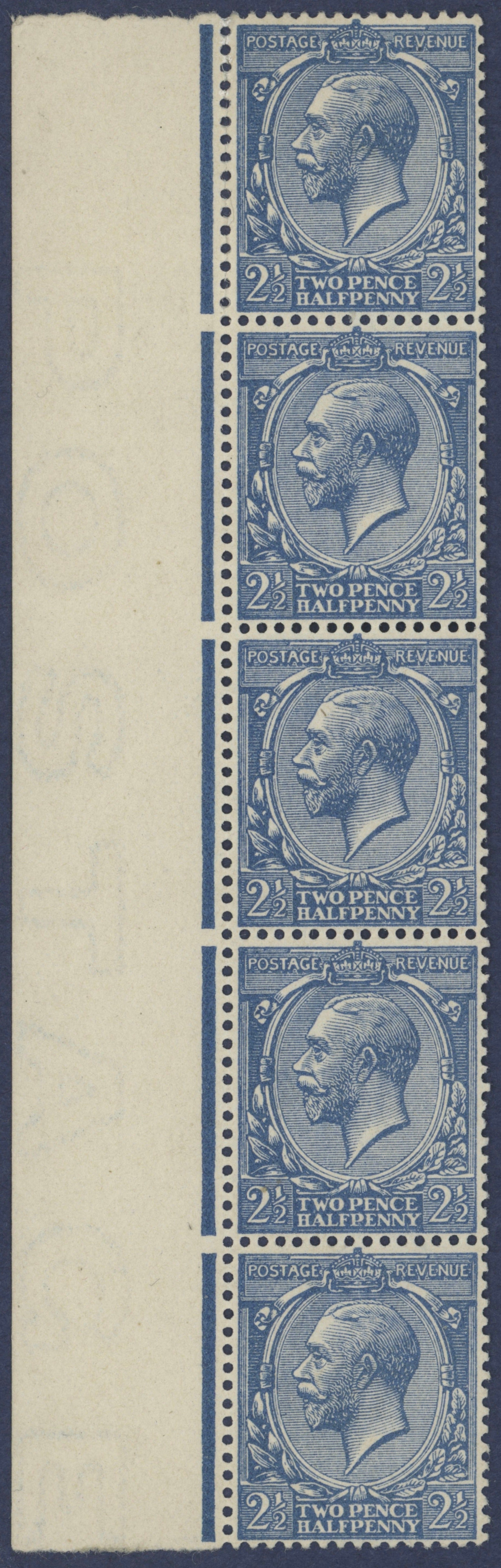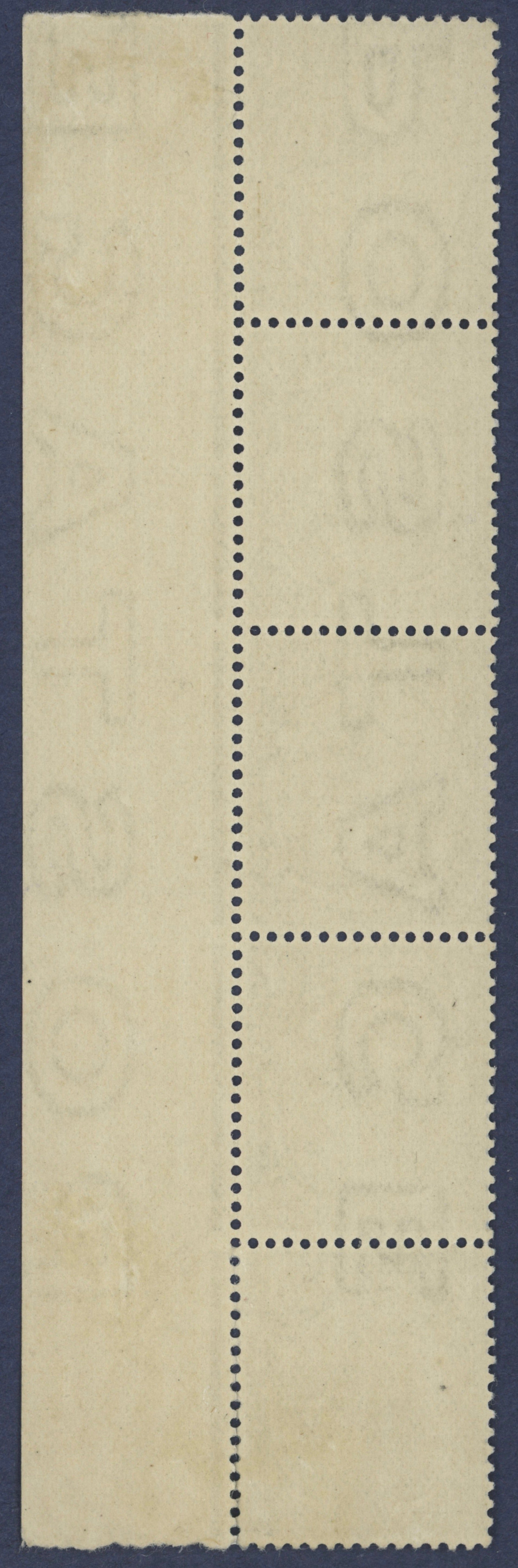 A very fine unmounted mint, with full original gum, left hand marginal vertical strip of five showing complete "POSTAGE" watermark with selvedge attached. The selvedge showing "POSTAGE" watermark inverted.