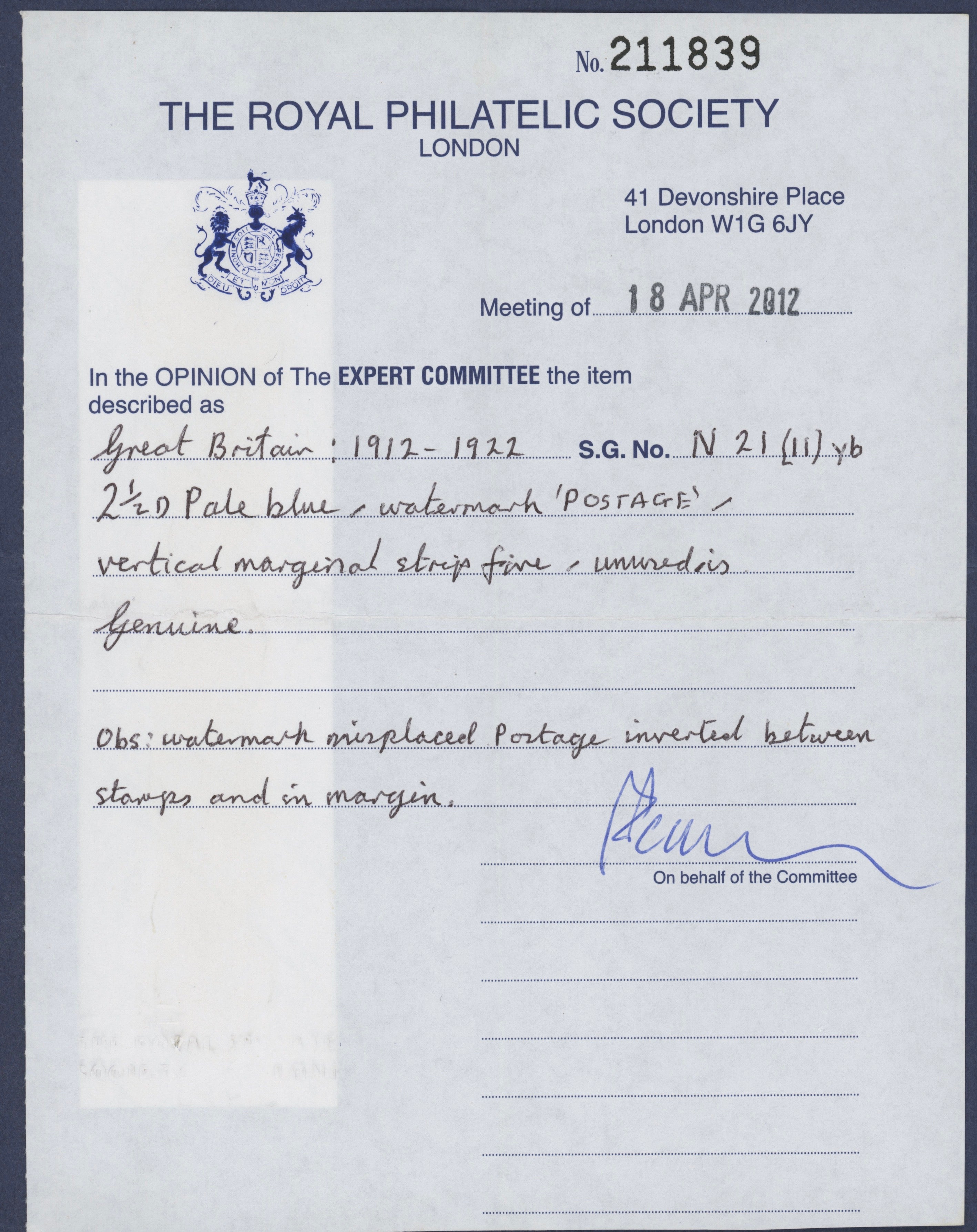 Accompanied with a 2012 Royal Philatelic Society (RPS) Certificate of Authenticity.