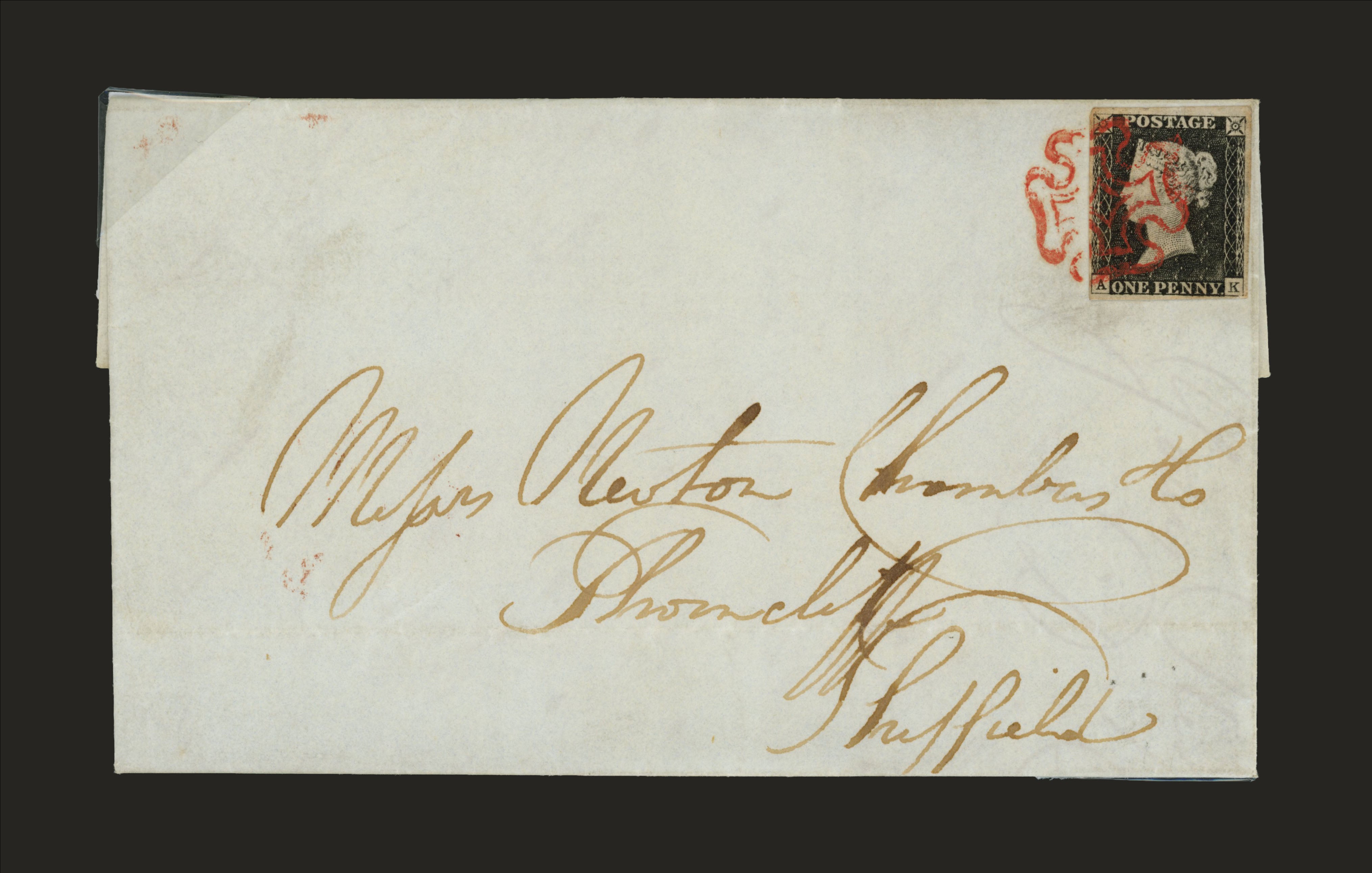 A very fine used four-margin example of the 1840 1d black from Plate 2, lettered 'AK', tied to a clean entire envelope by a crisp red Maltese Cross cancellation.