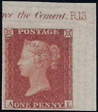 A superb unused top right hand corner marginal imperforate imprimatur lettered AL, showing part sheet inscription and plate number R.13.