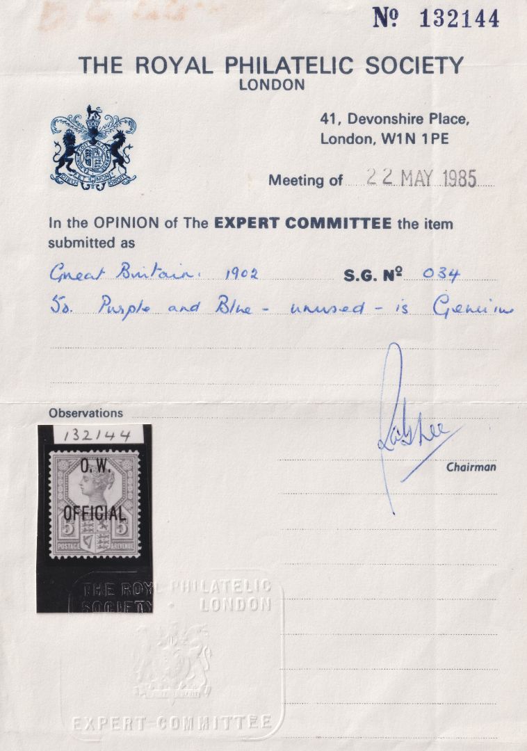 Accompanied with a 1985 Royal Philatelic Society (RPS) Certificate of Authenticity.