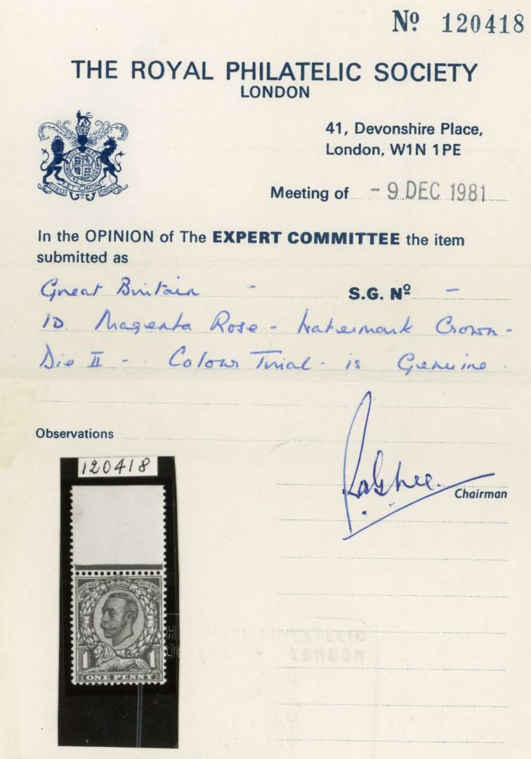 Accompanied with a 1981 Royal Philatelic Society (RPS) Certificate of Authenticity.